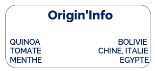 Quinoa Real instantané* (90%), légumes* (6%) (tomate*, oignon*, carottes*), sel marin, huile d’olive vierge extra*, persil*, menthe* (0,2%), amidon de maïs*, sucre de canne complet*.