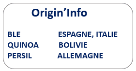 Semoule demi-complète de BLE dur * (origine Europe) (86,5%), quinoa* (origine Bolivie) (10%), persil* (3%), ail*