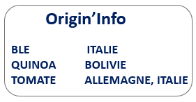 Semoule de BLE dur* (origine Europe) (89,3%), quinoa* (origine Bolivie) (10%), tomate*, betterave*, origan*.