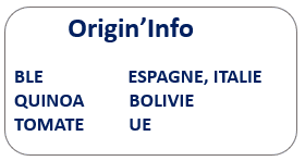 Semoule demi-complète de BLE dur* (origine Europe) (87,3%), quinoa* (origine Bolivie) (10%), tomate* (2%), ail*, arôme naturel de paprika, poudre d’OEUFS*.
