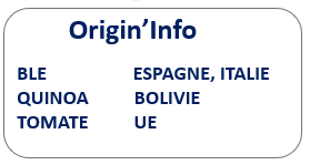 Semoule supérieure de BLE dur* (origine Europe) (85,9%), quinoa* (origine Bolivie) (10%), tomate* (3,8%), ail*