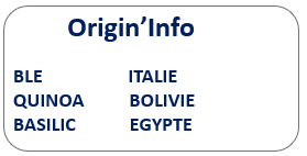 Semoule de BLE dur* (origine Europe) (85%), quinoa* (origine Bolivie) (10%), basilic*, betterave rouge*