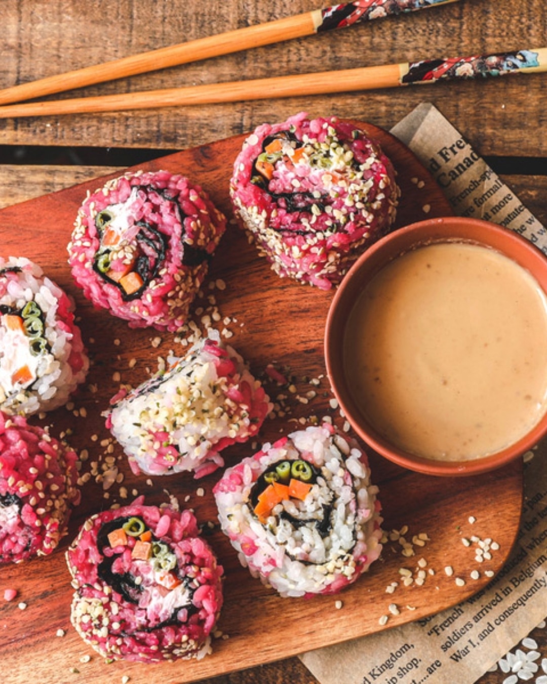 Nos California rolls sont ici des petites bouchées au riz et à l’algue nori garnies de légumes, éventuellement de fromage frais et enfin roulées dans des graines de chanvre. Vous pouvez colorer une partie de votre riz en rose à l’aide d’un peu de betterave.