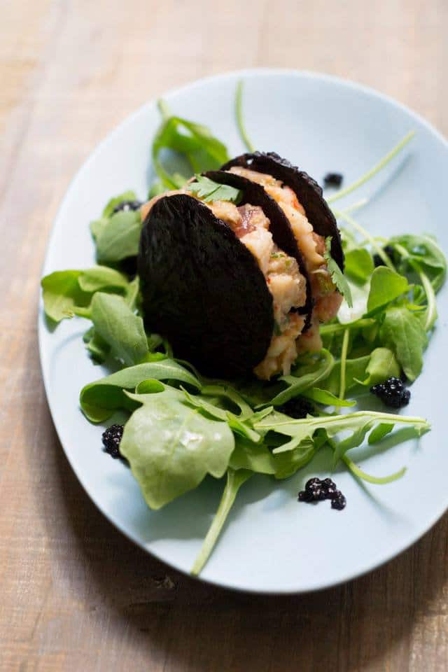 Millefeuille de chips de riz noir Priméal aux fruits de mer